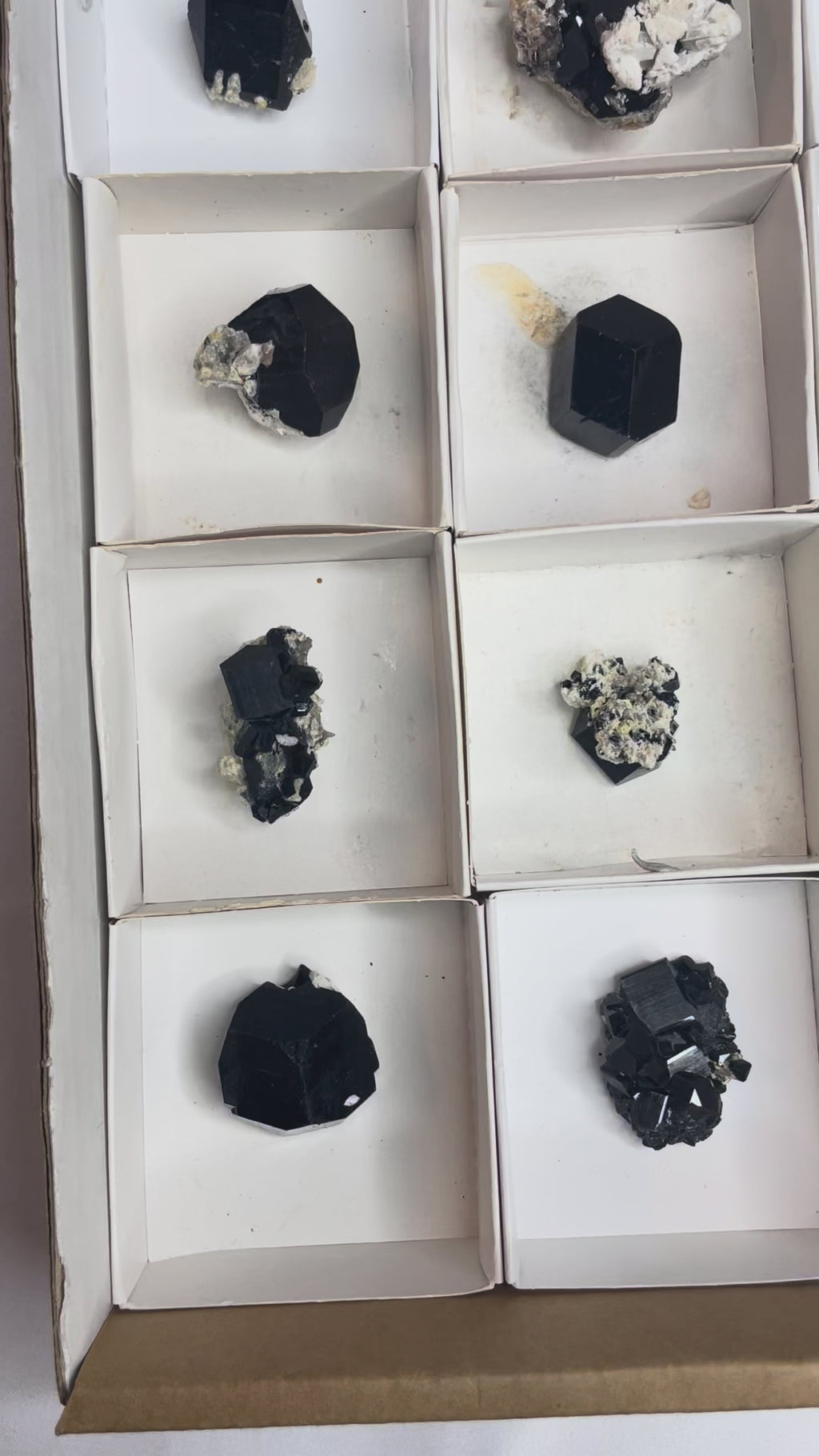 Exceptional 24-piece flat of black tourmaline from Erongo Mountain, Erongo Region, Namibia. This lot features a beautiful mix of well formed, lustrous black tourmaline pieces, some displaying Smoky Quartz and others accented by Hyalite opal coatings and clusters.