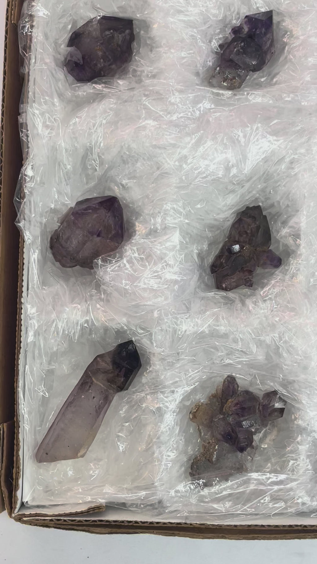 9-piece wholesale flat of beautiful shangaan amethysts, from the Chibuku Mine, Gezani Communal Land, Zimbabwe. This flat features vibrant purple colored, naturally terminated crystals, a distinctive Shangaan character.