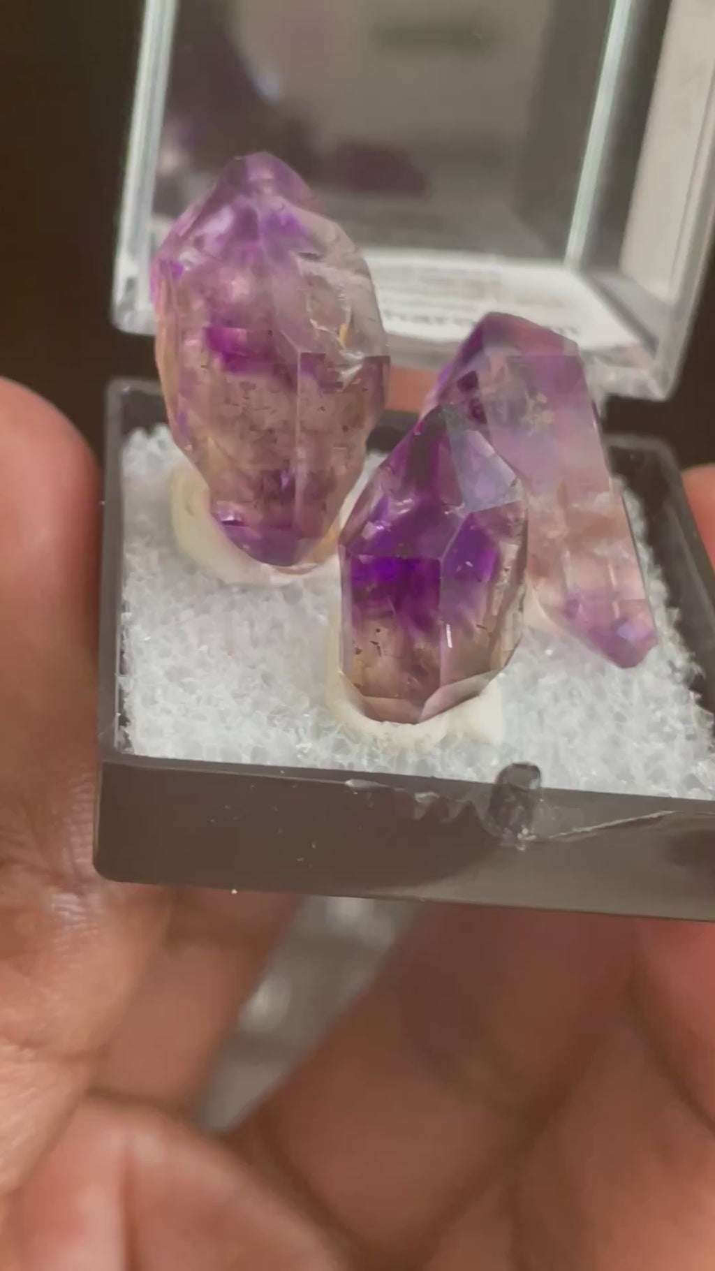 Another fine set of three Shangaan Amethyst crystals from the Chibuku Mine, Gezani Communal Land, Zimbabwe. One piece features a distinct scepter formation, while another exhibits a clean double termination. These highlight the natural diversity and beauty of Shangaan Amethyst, known for its striking purple saturation and collectible crystal habits. A perfect perky for enthusiasts who appreciate unusual miniatures.